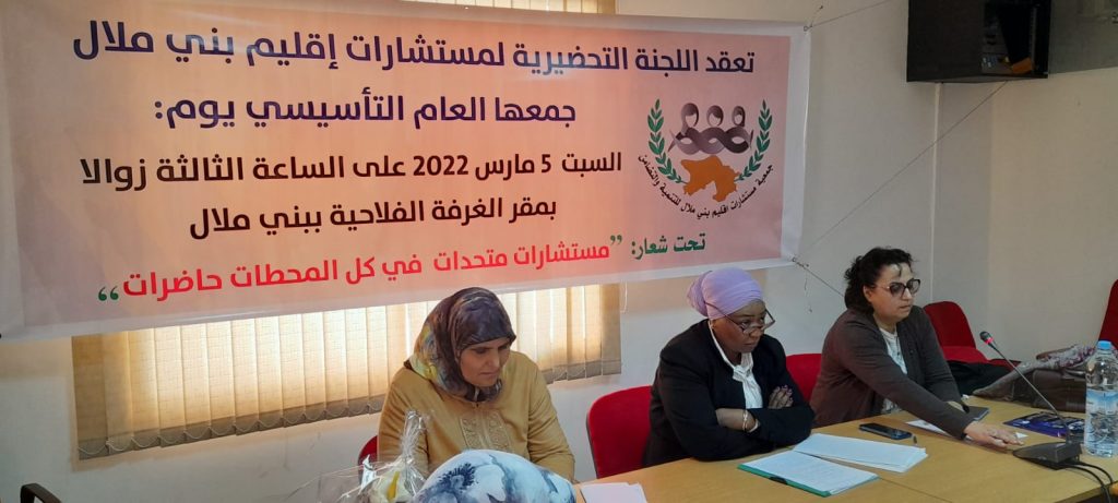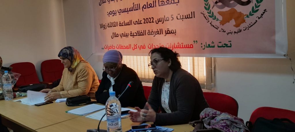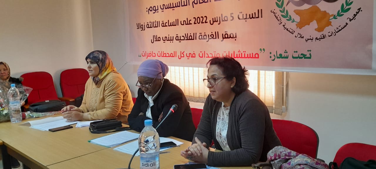 تحت شعار ” مستشارات متحدات في كل المحطات حاضرات ” شهدت مدينة بني ملال مساء يوم السبت 05/03/2022 بالغرفة الجهوية للفلاحة ، حدثا سياسيا بارزا تمثل في ميلاد جمعية المنتخبات بإلإقليم ، وهي جمعية تروم تشكيل قوة نسائية بمختلف ألوانها السياسية من أجل الدفاع عن المناصفة في كل المجالات ، وتقوية قدرات المرأة داخل المجالس المحلية ، الإقليمية والجهوية .